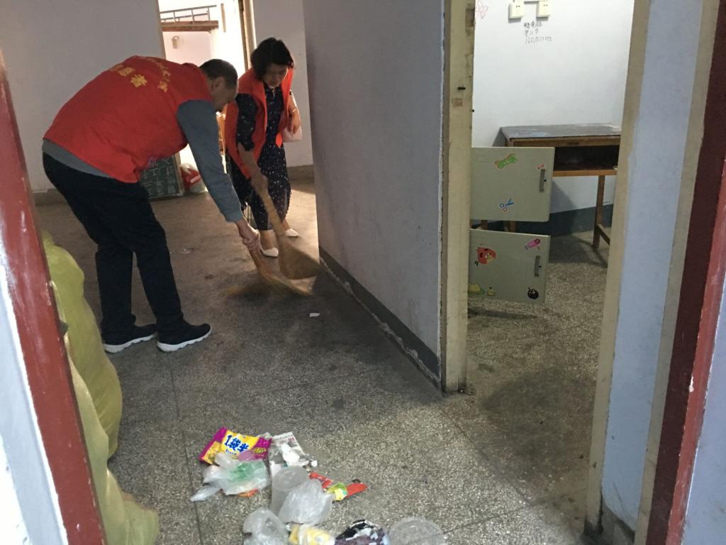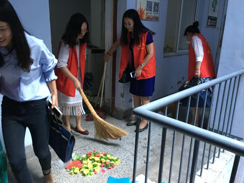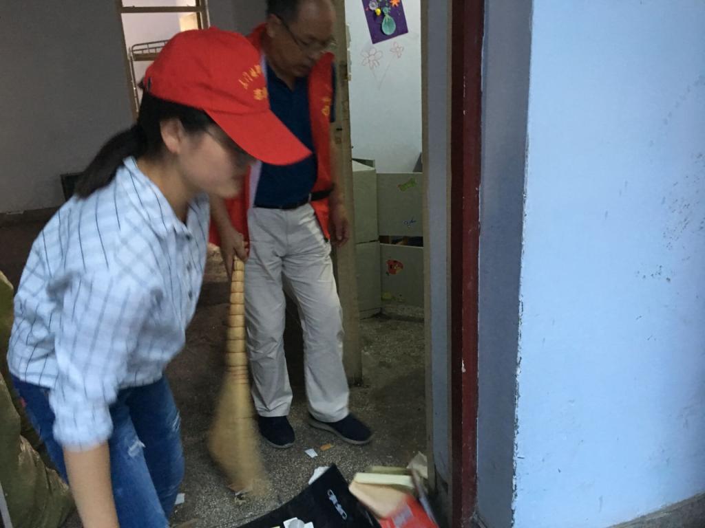 进入宿舍楼,按区域分工,教工第一支部教师负责一楼打扫,教工第二支部负责二楼打扫,教工第三支部教师及部分员工党员负责三至五楼打扫。宿舍房间及楼道楼梯到处是杂物,很多是书本、纸袋、蚊帐等废弃品。有的角落包括晾台、床下尘土很厚,脏乱不堪。老师们二话不说,挥舞扫帚忙碌起来。只见垃圾桶一桶桶被装满,又一次次被抬至楼下,倾到到指定地点。几个小时过去,垃圾清扫完毕,宿舍面貌焕然一新。