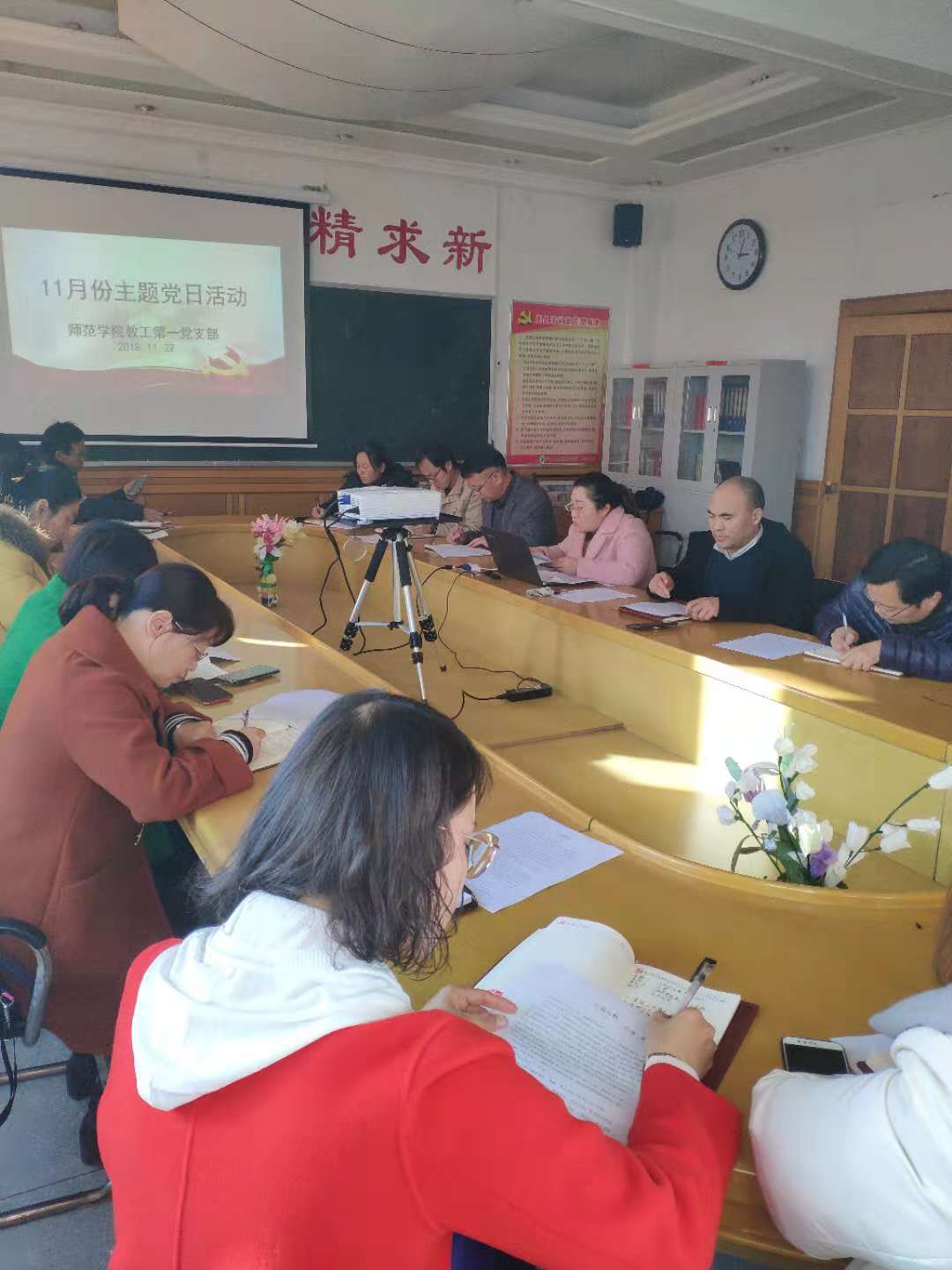 2018年11月22日下午三点,太阳集团tyc9728教工第一党支部在5204党员活动室开展了3+N主题党日活动。支部书记王斐主持活动,太阳集团tyc9728经理苑玉洁及第一支部全体党员参加了活动。
