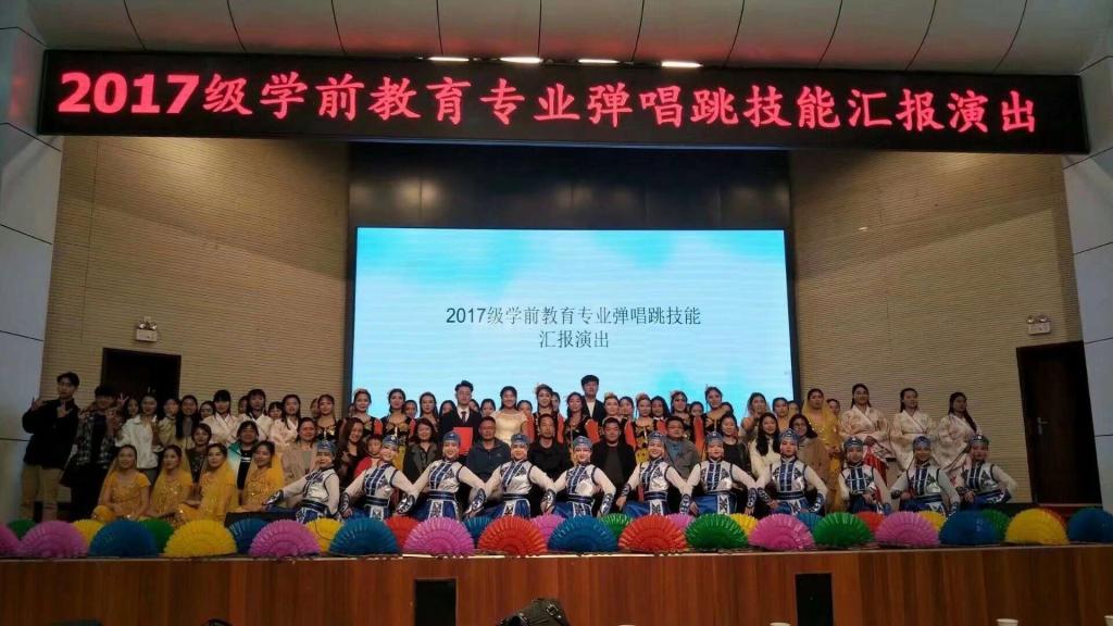 伴随着热闹的开场舞《大漠之花》,汇报演出正式拉开序幕。学前教育专业的同学们为现场观众呈现出精彩的表演。舞蹈《Rabbit game》、《远方的思念》等展示出其优美的舞姿;钢琴演奏《放马曲》、《梦中的婚礼》展现了同学们扎实的音乐基础;歌曲《出山》、《大鱼》声音美妙动听。吉他弹唱把演出推向了高潮。伴随着合唱《国家》,整场演出圆满落下帷幕。最后,全体演员与领导老师合影留念,共同记录下这美好的瞬间和珍贵的记忆。