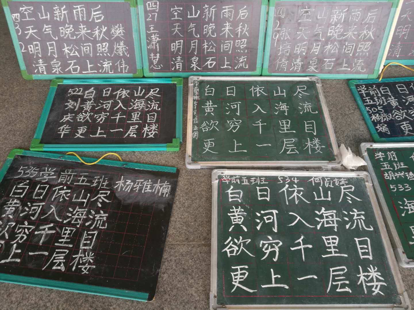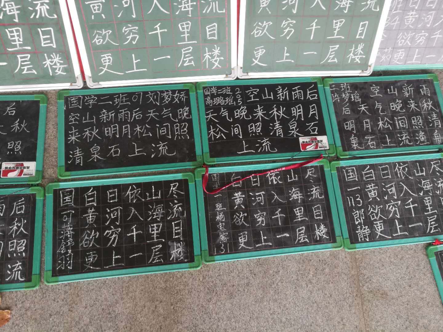 经过一段紧张的准备,作品终于展出,和大家见面了。共展出粉笔字100余幅(小黑板)其中国学班三十余幅;钢笔字三个版面共139幅,其中国学班一一个版面四十幅。作品展在五号教学楼一楼大厅及门外廊下平台。我的粉笔字、钢笔字作品均得以参展,我感到小欣喜不已。