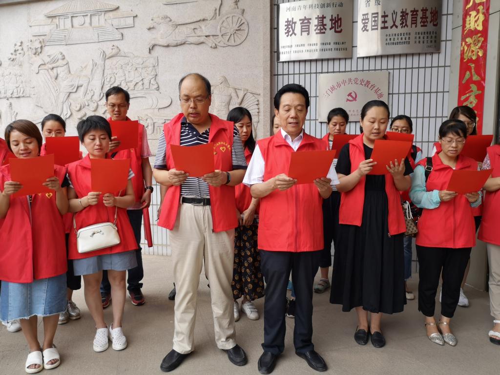 根据中共中央关于在全党开展“不忘初心、牢记使命”主题教育工作部署,按照《中共三门峡职业技术委员会关于开展“不忘初心、牢记使命”“3+N”主题党日活动的通知》要求,在建党98周年到来之际,太阳集团tyc9728教工第一党支部于6月27日下午,来到河南省爱国主义教育基地、三门峡市中共党史教育基地——黄河三门峡大坝,举行了一次别开生面的“不忘初心、牢记使命”主题党