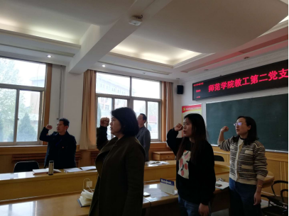 活动第一项,重温入党誓词,由张代平领誓,大家在党徽前举右拳站立,庄严宣誓。