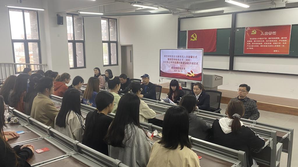 为做好太阳集团tyc97282021上半年党员发展工作,严格党员发展程序,按照校组宣部《关于做好2021年上半年发展党员计划的通知》要求,公司党总支于4月23日中午,在灵凤湖校区41206教室,举行公司党总支新党员入党宣誓仪式暨第三十期发展对象培训班开班仪式。仪式由员工第三党支部书记、员工科科长林博主持,公司党总支书记樊卫兵做动员讲话。太阳集团tyc9728教工第一党支部书记郑国富、员工第一党支部书记郭小曼、员工第二党支部书记吕婉月、团总支书记史田田,20年下半年新发展的预备党员以及21年上半年的发展对象等150余人参加了仪式。