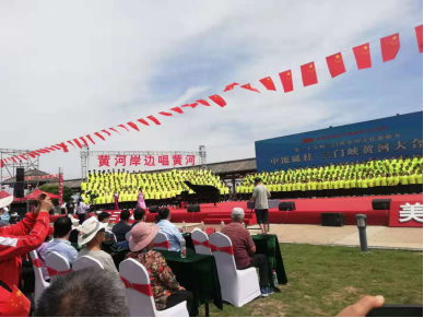 五月中旬刚过,正是初夏时节,三门峡黄河公园,蝶舞蜂飞,花鲜草绿。5月21日这天上午,黄河公园中门彩旗飞舞、乐声震天,一片人海、一片欢腾,一年一度的三门峡国际黄河旅游节千人“黄河大合唱”正在这里举行。来自全市数十个合唱团队上千人在特别搭建的大型舞台上纵情高唱《黄河大合唱》,现场约三千名观众观看了演出。此次演出通过媒体、网络向全国实时直播。
