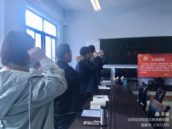 活动第一项,全体党员重温入党誓词。薛新萍老师领誓。