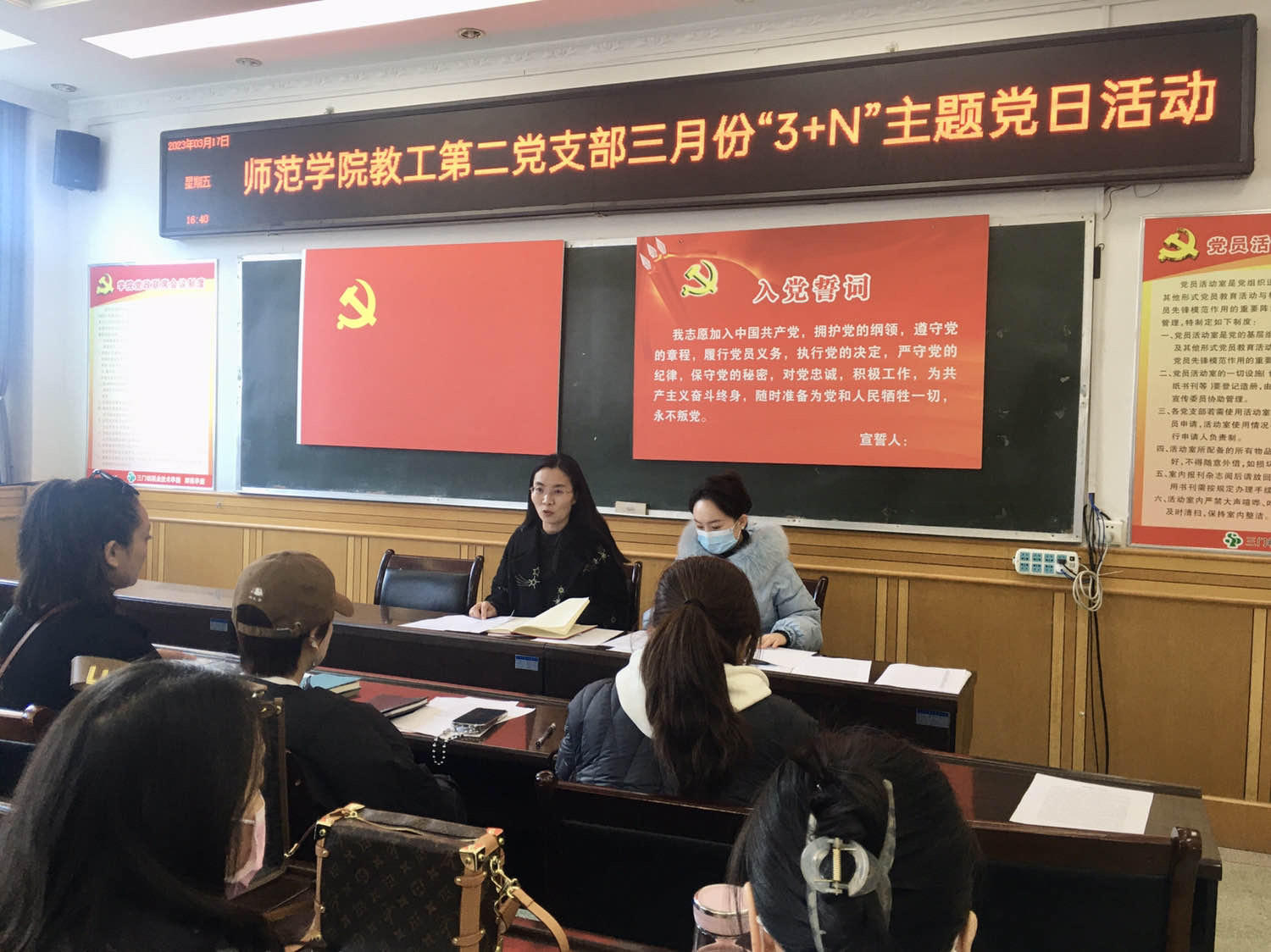 第一项:重温入党誓词。全体党员列队面向党旗,在支部组织委员许文婧同志带领下重温入党誓词,党员们高举右手庄严宣誓,坚定信念。