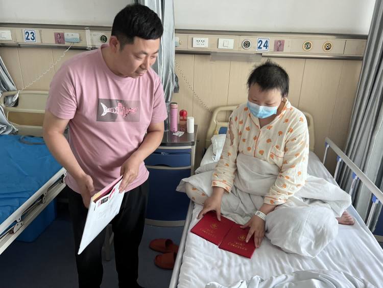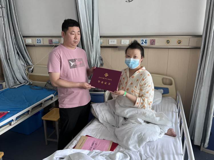 在病房里,林博科长、曹生华老师详细了解了宋婉娜同学的病情和治疗情况,并把慰问金1万元交到了宋婉娜手里,鼓励她及其家人振作精神,以坚强、乐观的心态与疾病抗争。辅导员曹生华亲自把职业技能等级证书、毕业证书颁发给宋婉娜,并语重心长地对宋婉娜同学说:“现在的医疗科技很发达,你的身体一定会好起来,希望你一定要乐观、坚强,积极配合医生治疗,争取早日康复”。宋婉娜及其家人对学校领导、老师和同学们的关心和帮助表示感谢,并表示会调整心态、积极治疗、自强不息面对生活中的困境。