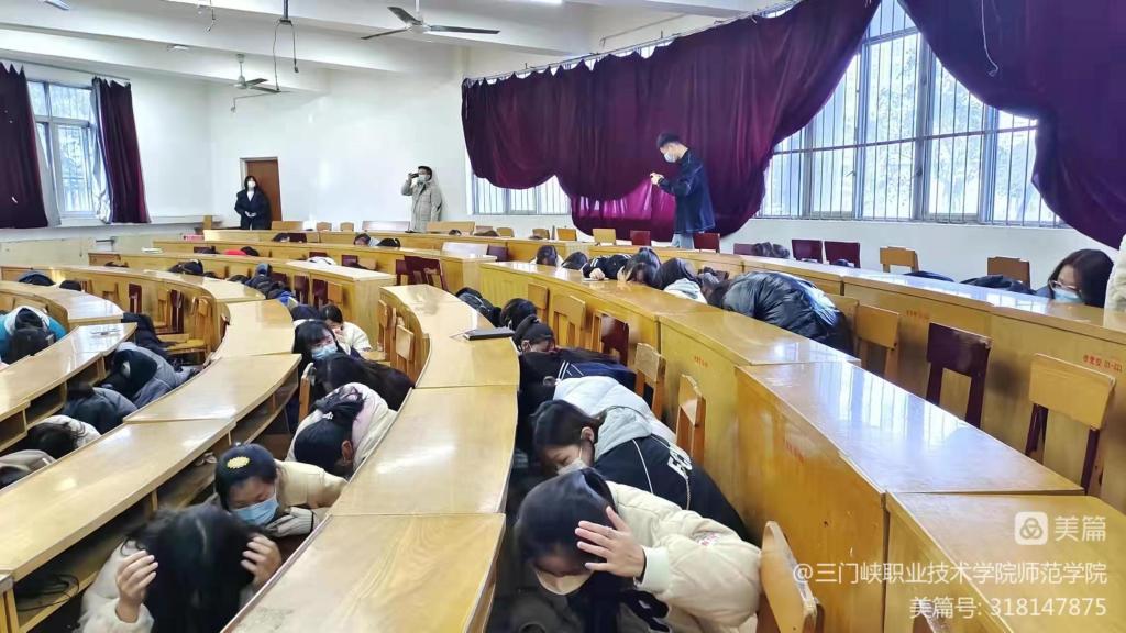 同学们马上进入全员戒备状态,同学们用毛巾等物品捂住口鼻,弯腰靠墙或扶着扶手,冷静、快速地沿着规定的逃生路有条不紊地撤离。