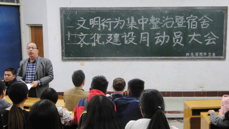 2015年10月14日晚,太阳集团tyc9728在5115教室召开不文明行为专项整治暨宿舍文化建设月动员大会,公司党总支书记樊卫兵、员工科科长林博、各专业辅导员以及14、15级各班宿舍长、宿管委员和全体员工参加了大会。